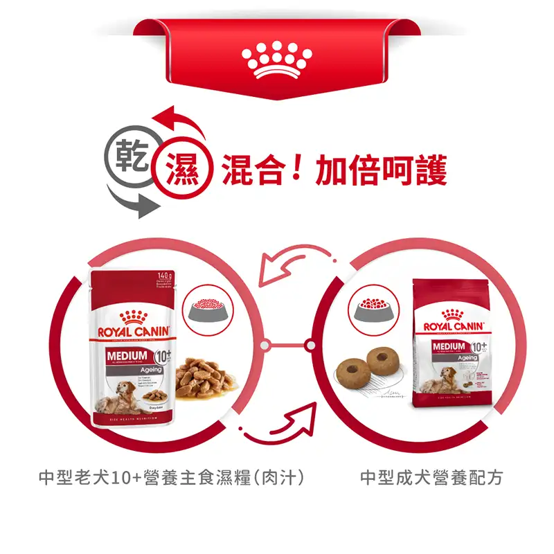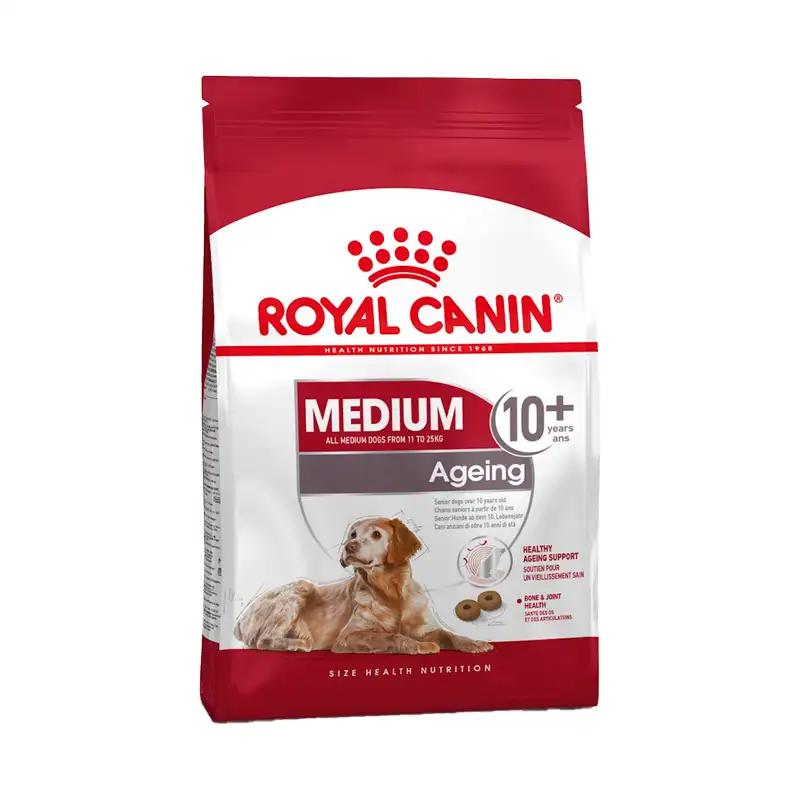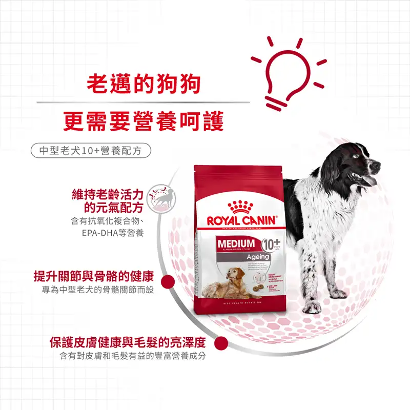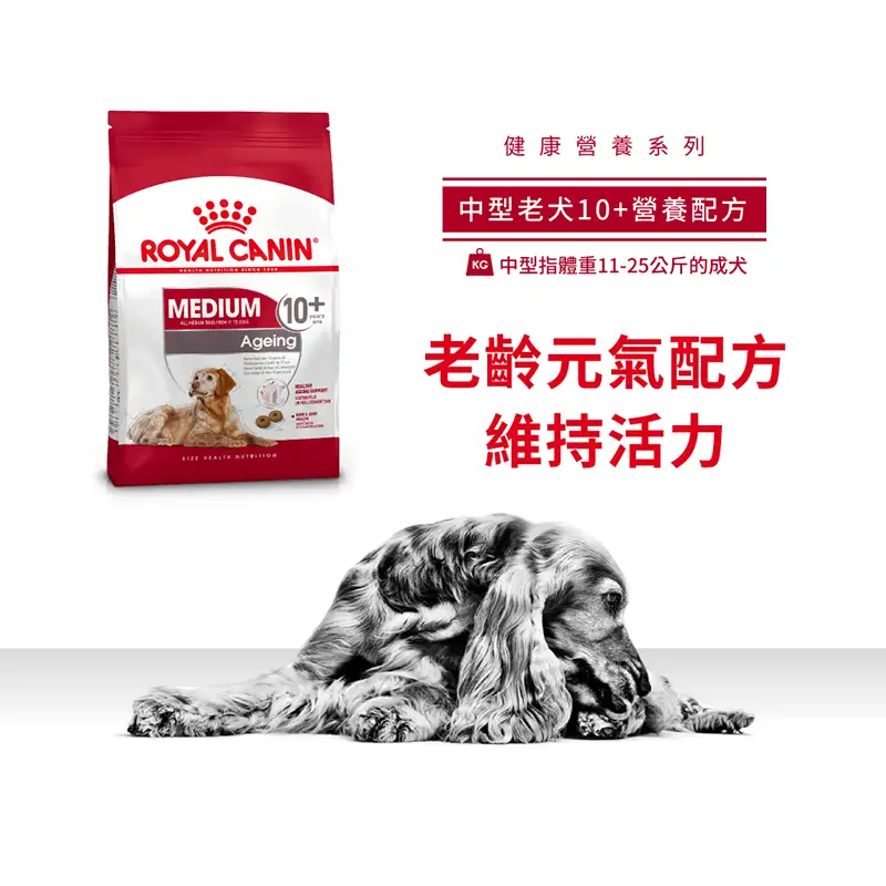 Royal Canin 法國皇家 中型老犬10+營養配方乾糧適合10歲以上, 體重在11kg至25kg之間的中型犬, 當中含有你的年長老犬所需要的全部營養, 配方是專門為你的中型犬能夠在衰老期間仍然保有活力而配製的, Royal Canin 法國皇家 中型老犬10+營養配方乾糧中所含有的獨家抗氧化複合物可以幫助中和自由基, 讓老犬身體內的重要分子保持在良好的狀態, 從而有助於整體健康。Royal Canin 法國皇家 中型老犬10+營養配方乾糧還含有EPA及DHA。